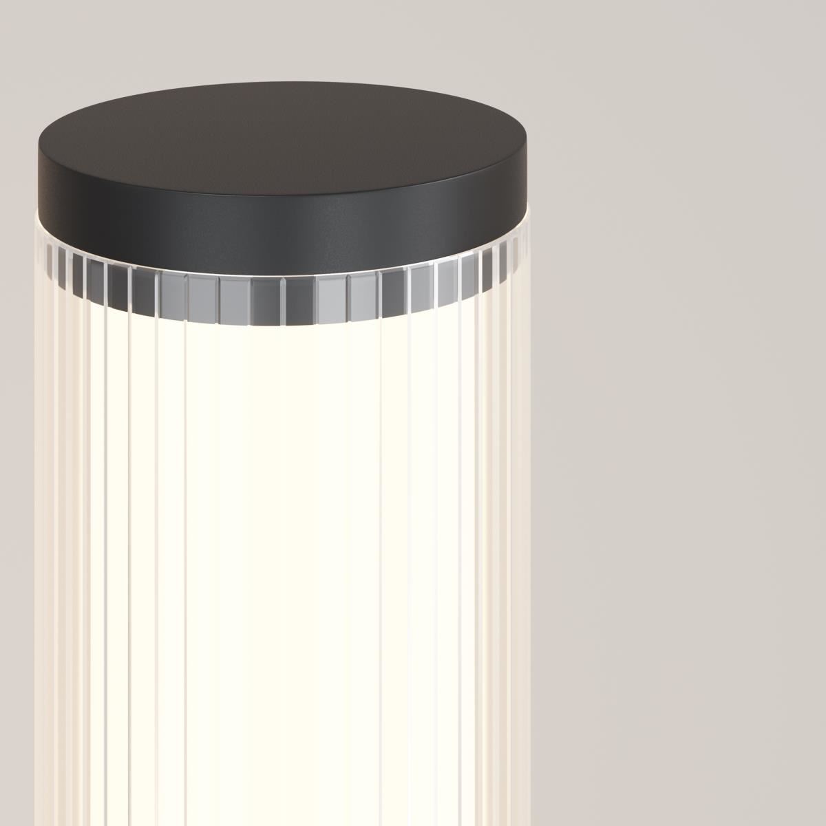 Материал арматуры — акрил, алюминий. Цвет черный. Двойной плафон — внутри белый матовый акрил, снаружи декоративный прозрачный акрил с рельефными линиями. Три размера — три варианта мощности. LED источник света. Цветовая температура 3000К. Защита корпуса от пыли и влаги — IP65.