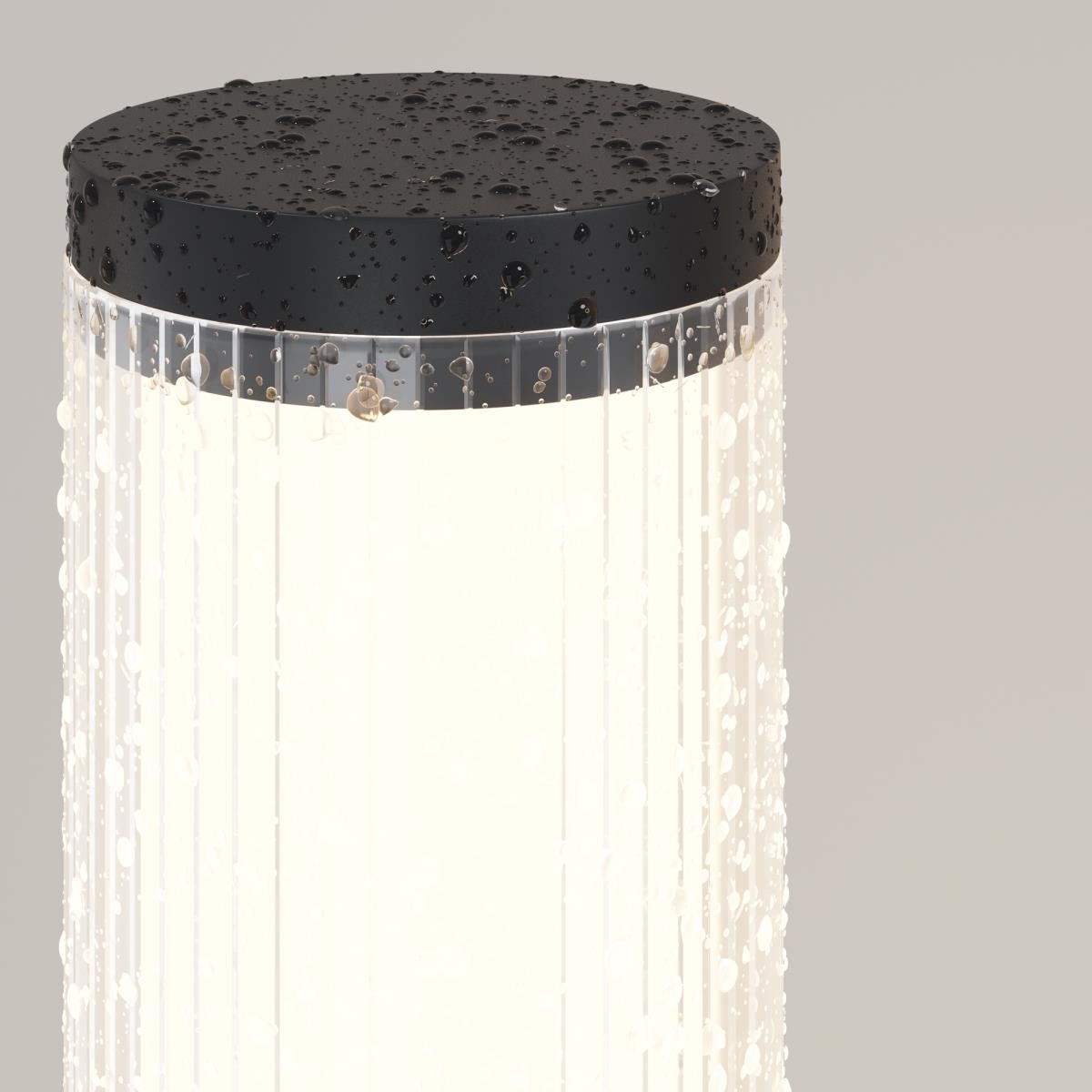 Материал арматуры — акрил, алюминий. Цвет черный. Двойной плафон — внутри белый матовый акрил, снаружи декоративный прозрачный акрил с рельефными линиями. Три размера — три варианта мощности. LED источник света. Цветовая температура 3000К. Защита корпуса от пыли и влаги — IP65.