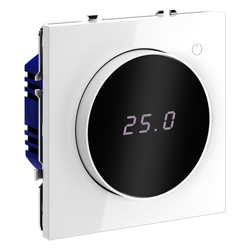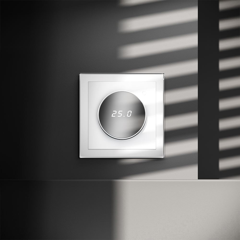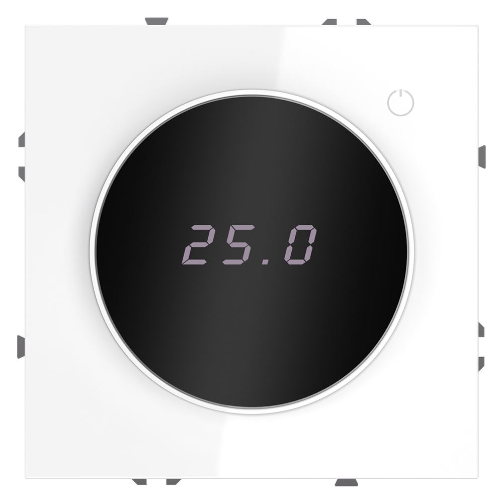 Место установки. Терморегуляторы Voltum предназначены для регулирования температуры электрического теплого пола. Актуальны как в городских квартирах, так и в загородных дачных домах без центрального отопления. Корпус. Дизайн терморегуляторов Voltum сочетается со стилем остальных электрических устройств компании. Они совместимы со всеми рамками S70. Материал внешних декоративных элементов — поликарбонат. Конструктивные особенности. Терморегулятор предназначен для работы с электрическими тёплыми полами различных типов и рассчитан на нагрузку до 3500 Вт. Устройство оснащено дисплеем, на котором отображается температура поверхности пола, обеспечивая удобный контроль системы обогрева. Устройства оснащены светодиодной индикацией режима и дисплеем, на котором отображается температура поверхности пола. Красный индикатор — «подача питания на нагревательный кабель (идет процесс нагрева)», отсутствие индикации — «заданная температура достигнута». В течение 15 минут после нагрева терморегулятор переходит в интеллектуальный «спящий режим», уменьшая яркость подсветки цифр и сокращая энергопотребление. Регулировка осуществляется вращением панели управления. Терморегулятор поставляется в комплекте с механизмом из пластиковой накладки и датчиком температуры.