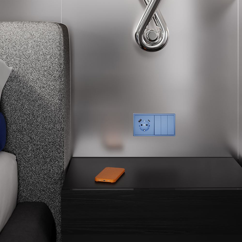 Модульная система серии S70 с раздельной поставкой механизмов, накладок и рамок позволяет монтировать электротехническую основу во время черновых работ, а выбор стилевого решения отложить до завершения дизайн-проекта. При смене интерьера вы легко обновите внешний вид, заменив только лицевые панели без вмешательства в проводку. Лёгкость и яркость оттенка Деним" прекрасно комбинируется с голубо-бирюзовой палитрой. Он станет удачным выбором для детских пространств и интерьеров кафе, добавляя им живости и современности."