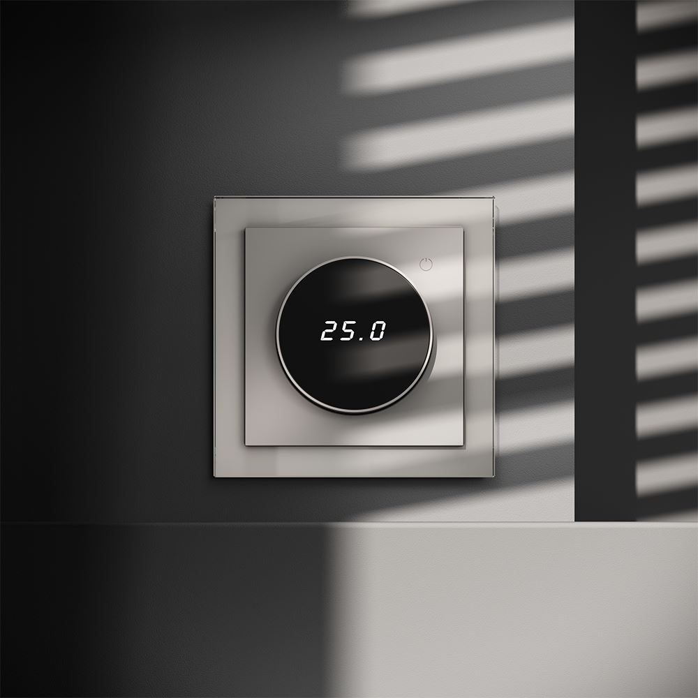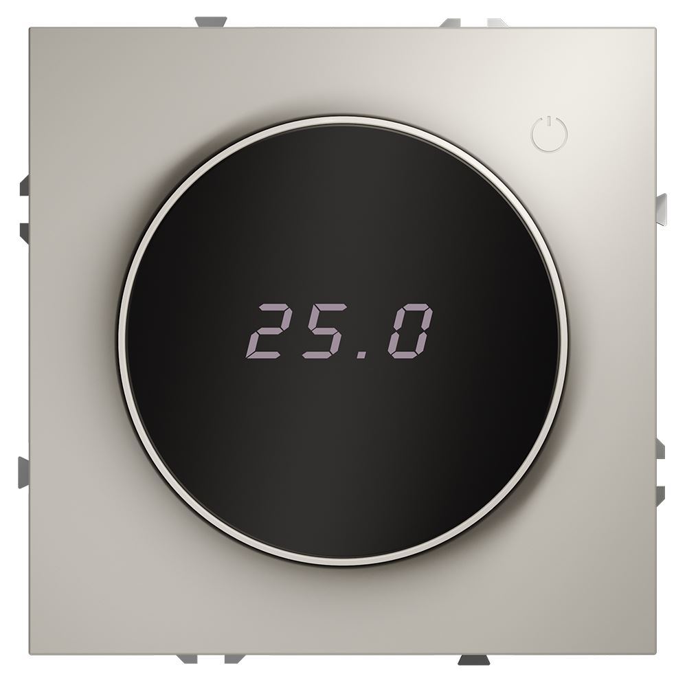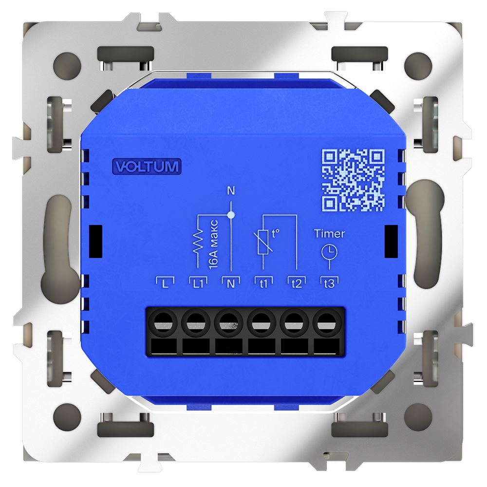Место установки. Терморегуляторы Voltum предназначены для регулирования температуры электрического теплого пола. Актуальны как в городских квартирах, так и в загородных дачных домах без центрального отопления. Корпус. Дизайн терморегуляторов Voltum сочетается со стилем остальных электрических устройств компании. Они совместимы со всеми рамками S70. Материал внешних декоративных элементов — поликарбонат. Конструктивные особенности. Терморегулятор предназначен для работы с электрическими тёплыми полами различных типов и рассчитан на нагрузку до 3500 Вт. Устройство оснащено дисплеем, на котором отображается температура поверхности пола, обеспечивая удобный контроль системы обогрева. Устройства оснащены светодиодной индикацией режима и дисплеем, на котором отображается температура поверхности пола. Красный индикатор — «подача питания на нагревательный кабель (идет процесс нагрева)», отсутствие индикации — «заданная температура достигнута». В течение 15 минут после нагрева терморегулятор переходит в интеллектуальный «спящий режим», уменьшая яркость подсветки цифр и сокращая энергопотребление. Регулировка осуществляется вращением панели управления. Терморегулятор поставляется в комплекте с механизмом из пластиковой накладки и датчиком температуры.