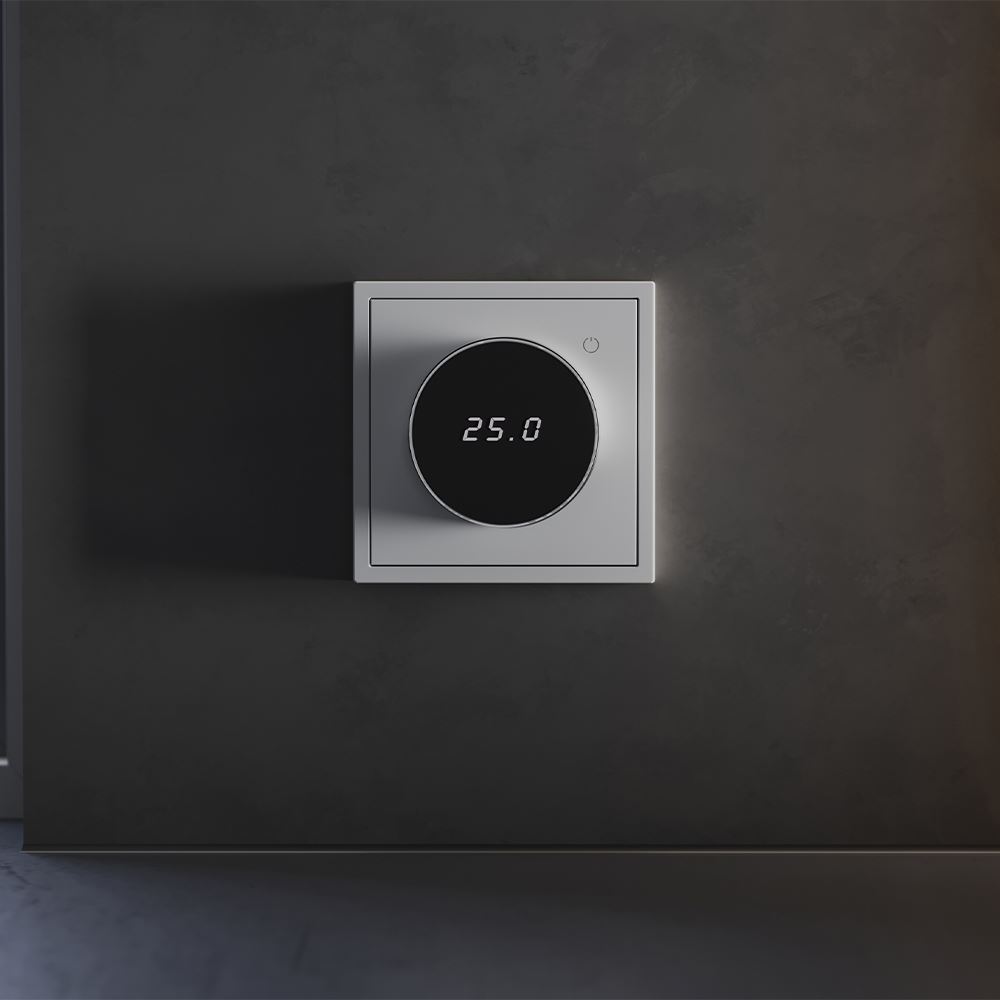 Место установки. Терморегуляторы Voltum предназначены для регулирования температуры электрического теплого пола. Актуальны как в городских квартирах, так и в загородных дачных домах без центрального отопления. Корпус. Дизайн терморегуляторов Voltum сочетается со стилем остальных электрических устройств компании. Они совместимы со всеми рамками S70. Материал внешних декоративных элементов — поликарбонат. Конструктивные особенности. Терморегулятор предназначен для работы с электрическими тёплыми полами различных типов и рассчитан на нагрузку до 3500 Вт. Устройство оснащено дисплеем, на котором отображается температура поверхности пола, обеспечивая удобный контроль системы обогрева. Устройства оснащены светодиодной индикацией режима и дисплеем, на котором отображается температура поверхности пола. Красный индикатор — «подача питания на нагревательный кабель (идет процесс нагрева)», отсутствие индикации — «заданная температура достигнута». В течение 15 минут после нагрева терморегулятор переходит в интеллектуальный «спящий режим», уменьшая яркость подсветки цифр и сокращая энергопотребление. Регулировка осуществляется вращением панели управления. Терморегулятор поставляется в комплекте с механизмом из пластиковой накладки и датчиком температуры.