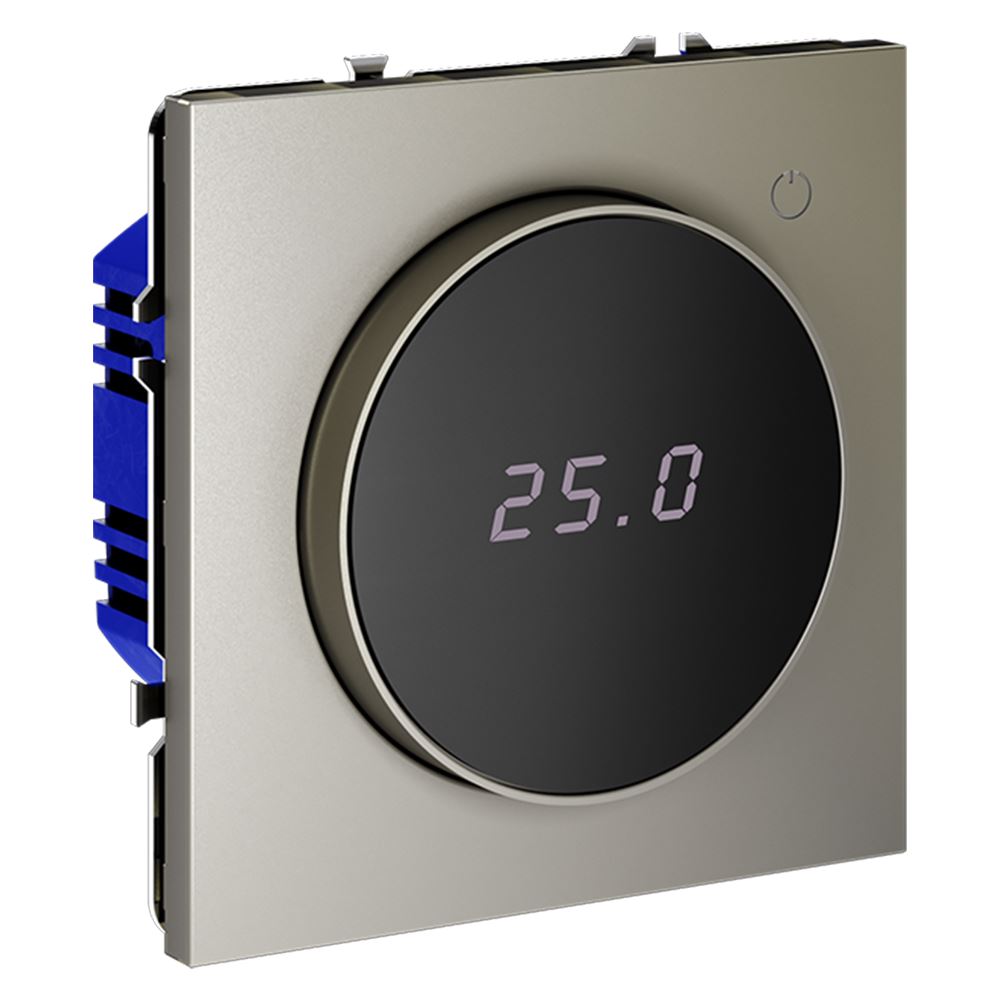 Место установки. Терморегуляторы Voltum предназначены для регулирования температуры электрического теплого пола. Актуальны как в городских квартирах, так и в загородных дачных домах без центрального отопления. Корпус. Дизайн терморегуляторов Voltum сочетается со стилем остальных электрических устройств компании. Они совместимы со всеми рамками S70. Материал внешних декоративных элементов — поликарбонат. Конструктивные особенности. Терморегулятор предназначен для работы с электрическими тёплыми полами различных типов и рассчитан на нагрузку до 3500 Вт. Устройство оснащено дисплеем, на котором отображается температура поверхности пола, обеспечивая удобный контроль системы обогрева. Устройства оснащены светодиодной индикацией режима и дисплеем, на котором отображается температура поверхности пола. Красный индикатор — «подача питания на нагревательный кабель (идет процесс нагрева)», отсутствие индикации — «заданная температура достигнута». В течение 15 минут после нагрева терморегулятор переходит в интеллектуальный «спящий режим», уменьшая яркость подсветки цифр и сокращая энергопотребление. Регулировка осуществляется вращением панели управления. Терморегулятор поставляется в комплекте с механизмом из пластиковой накладки и датчиком температуры.
